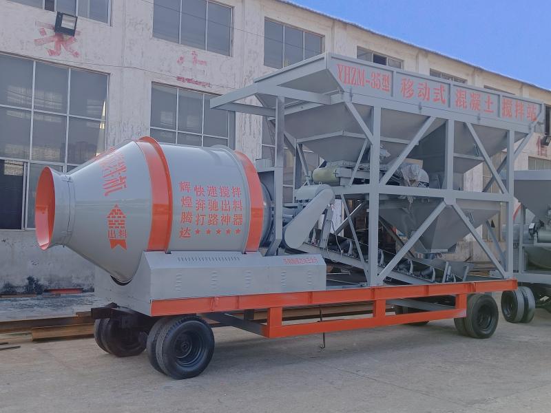 YHZM50 mobile drum concrete mixing plant adopts a JZM1000 drum concrete mixer, batching machine adopts a PLD1600 batching machine, the theoretical output is 50 cubic meters per hour.